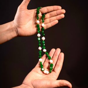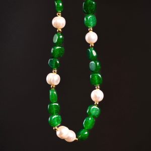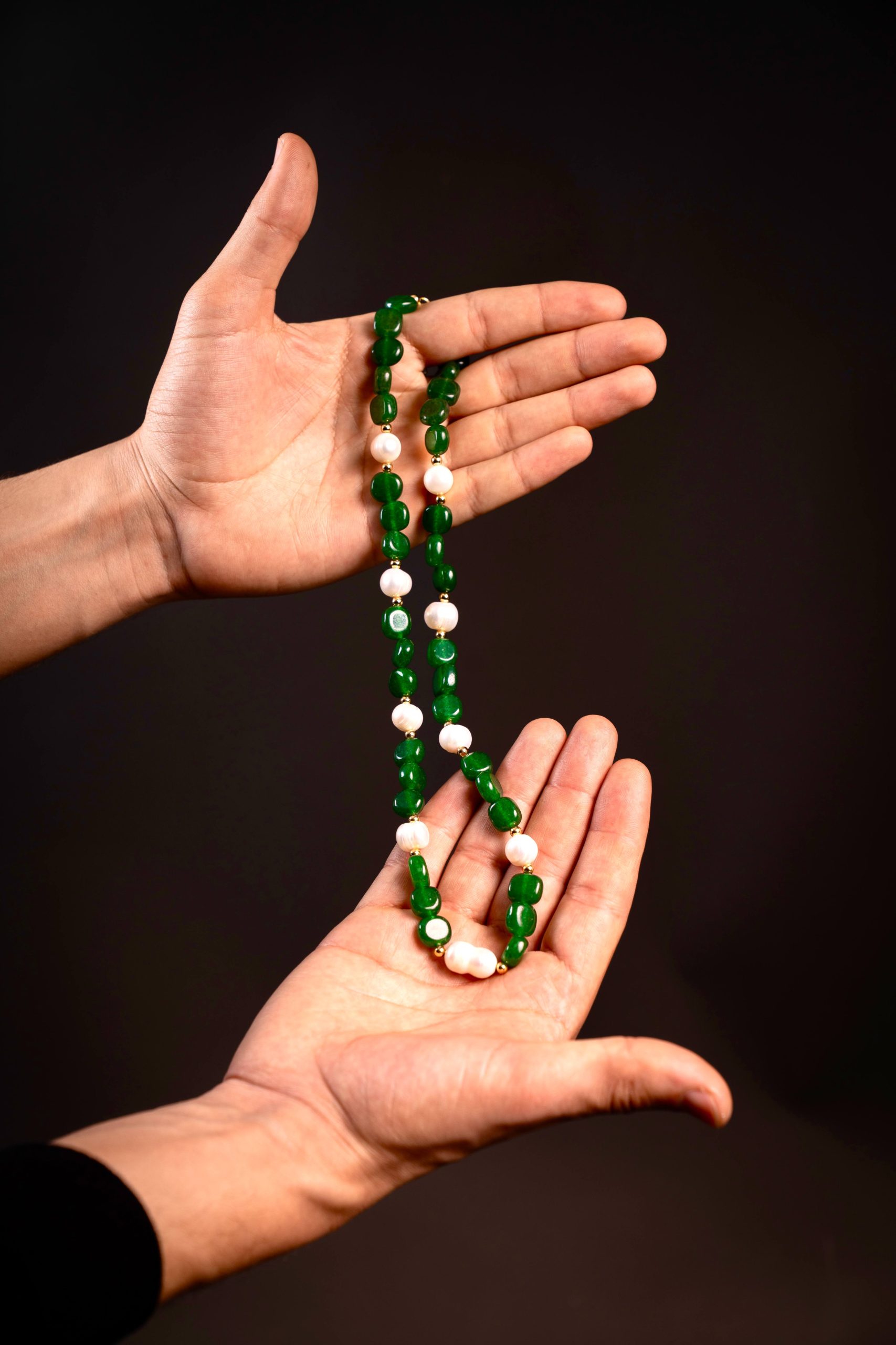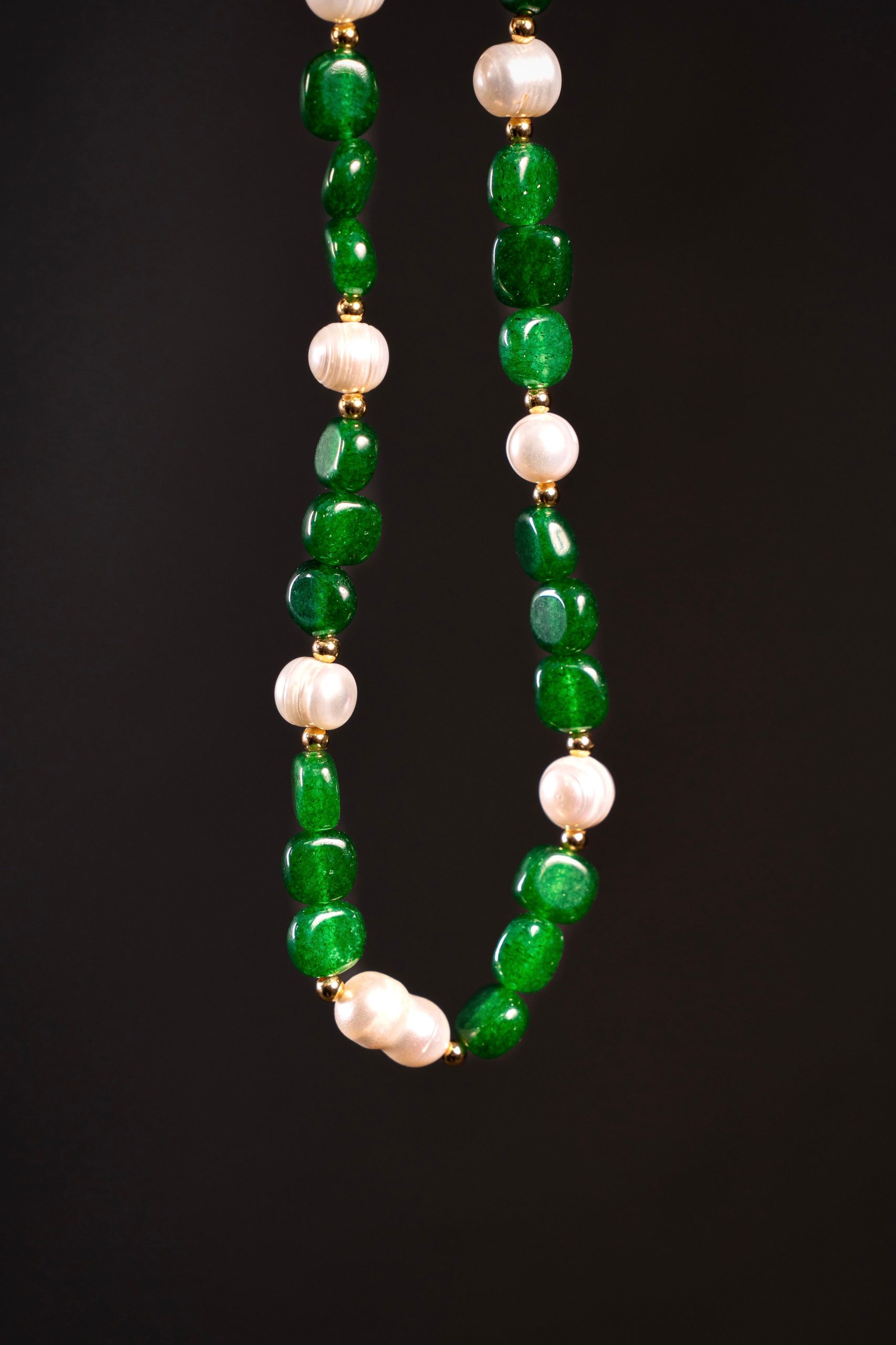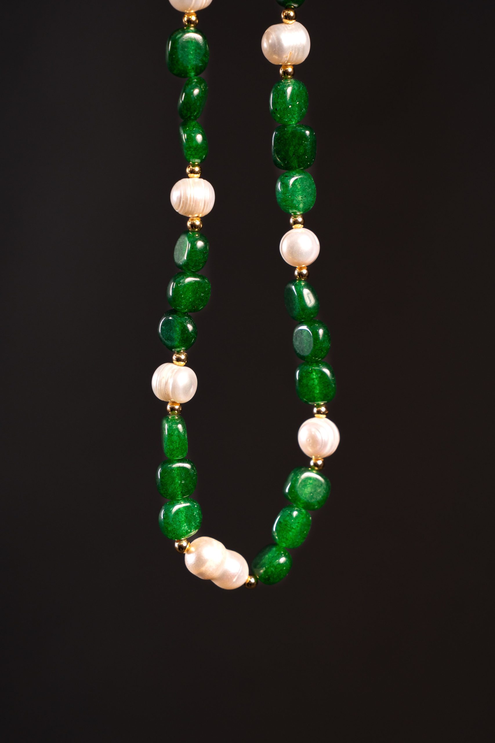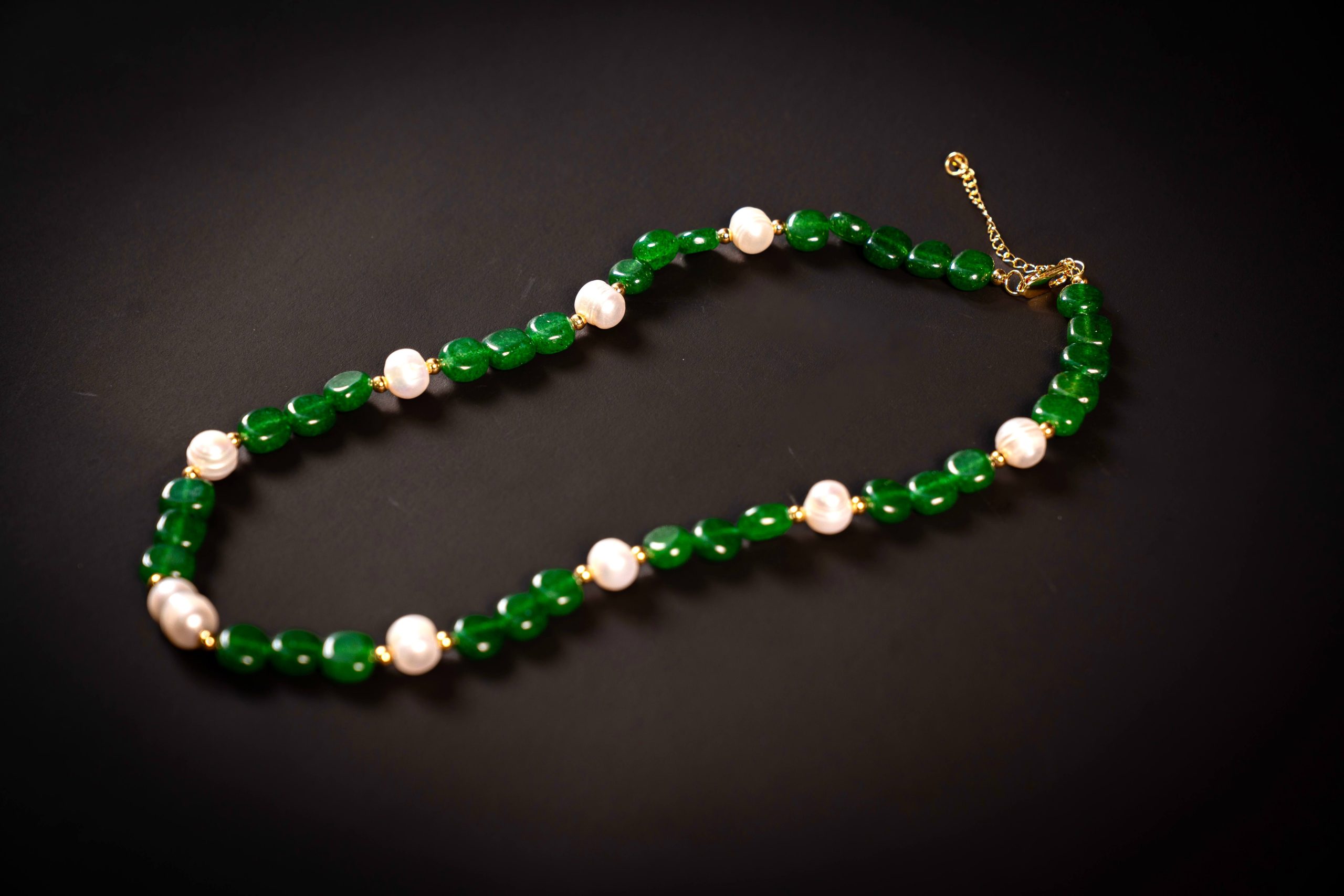 Natural green jade, known for its deep and calming tone, meets the soft luminosity of freshwater pearls in a composition that feels both grounding and elevated. Each stone is carefully selected to ensure harmony in color and proportion.
