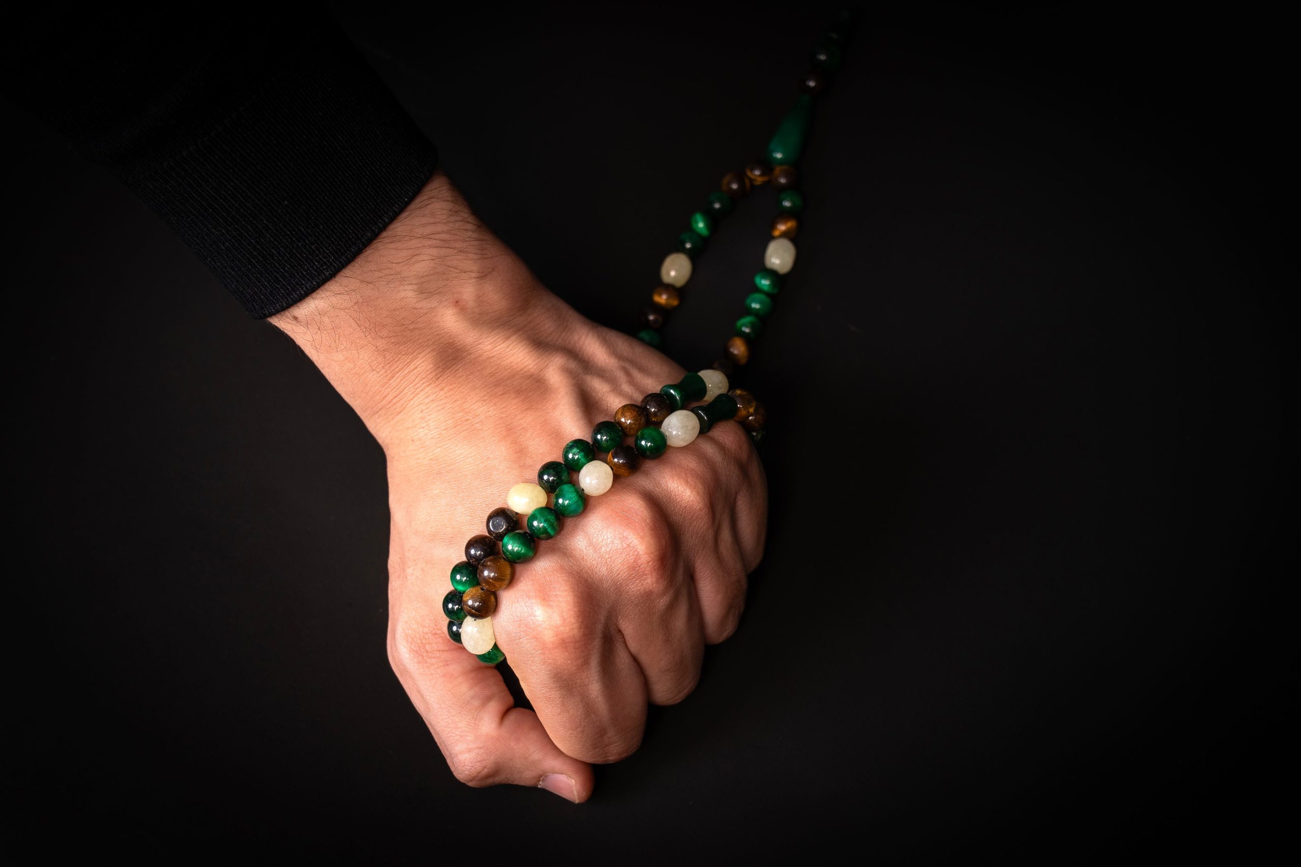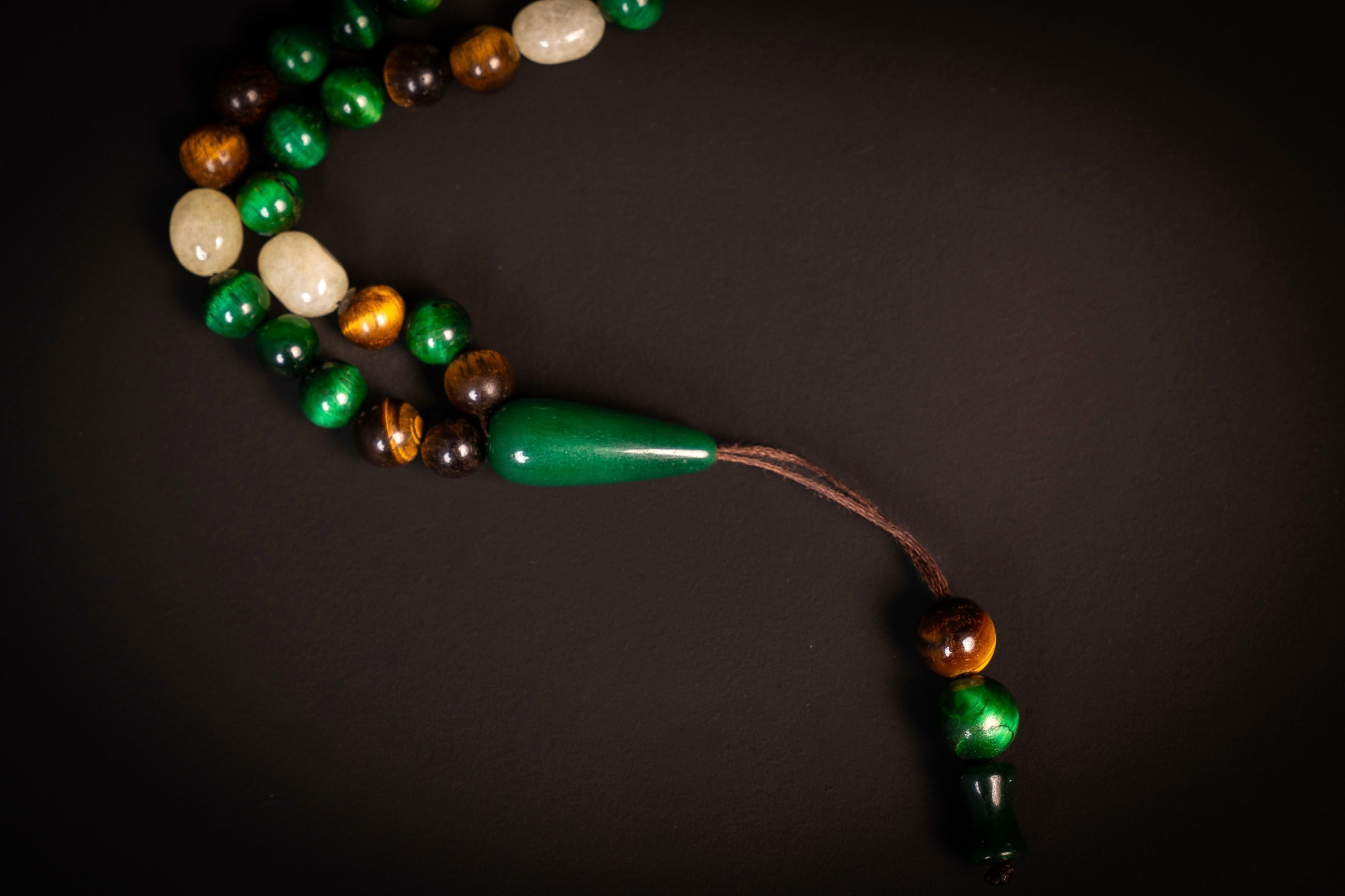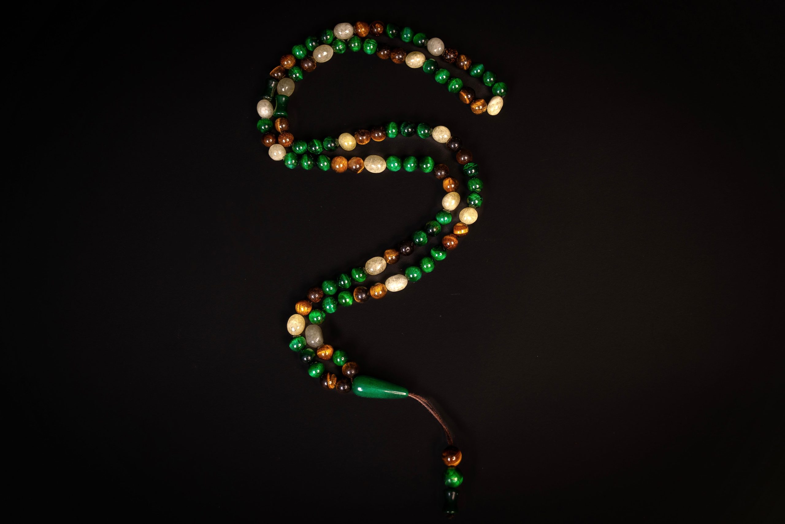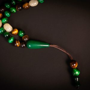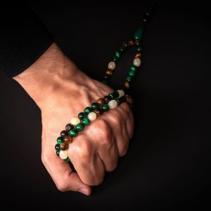 Crafted from a refined combination of natural Malachite, Tiger Eye, and Citrine, the Noor Al-Qalb 99 Misbaha brings together rich green depth, warm golden tones, and luminous accents in a harmonious composition.