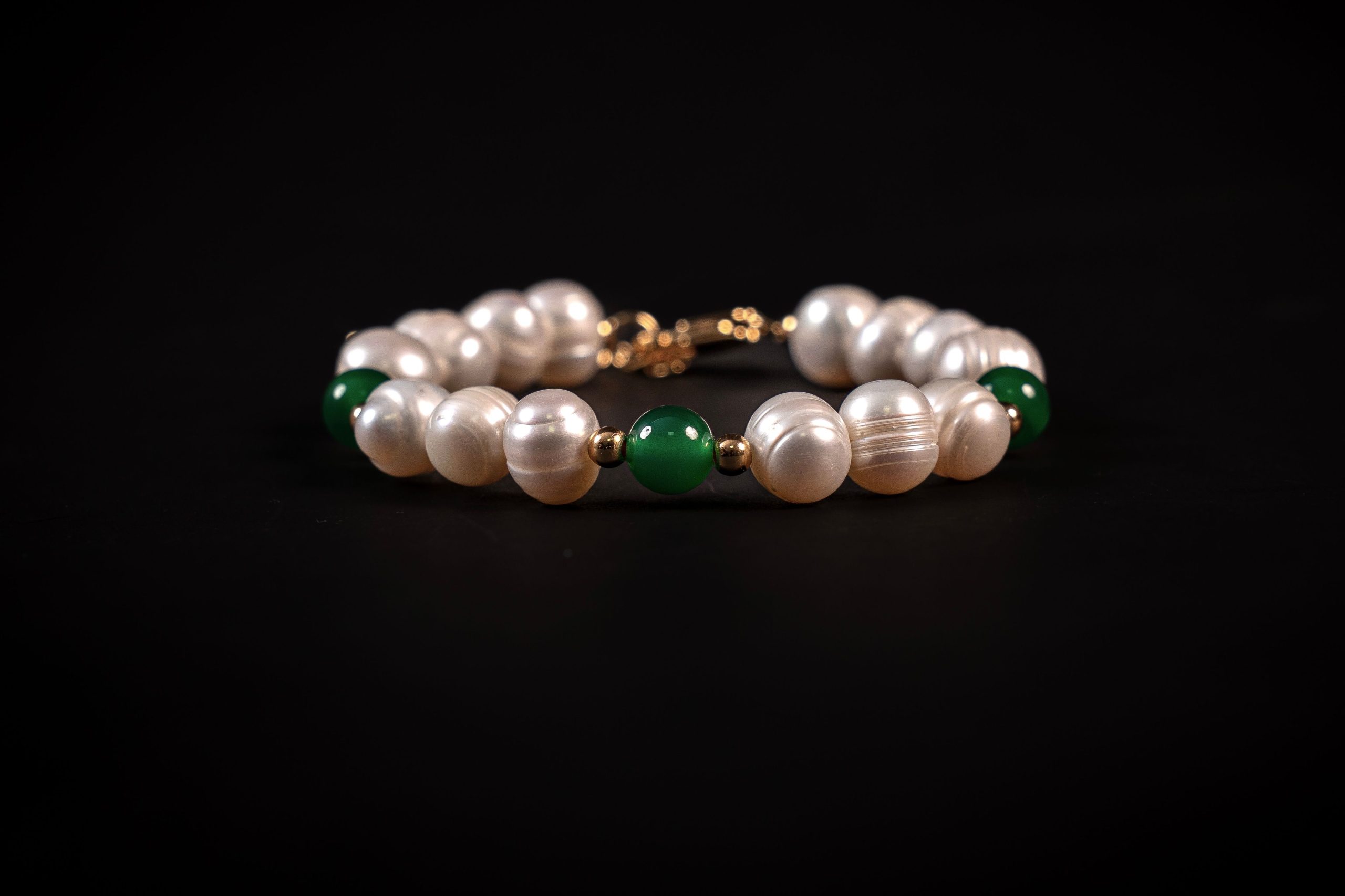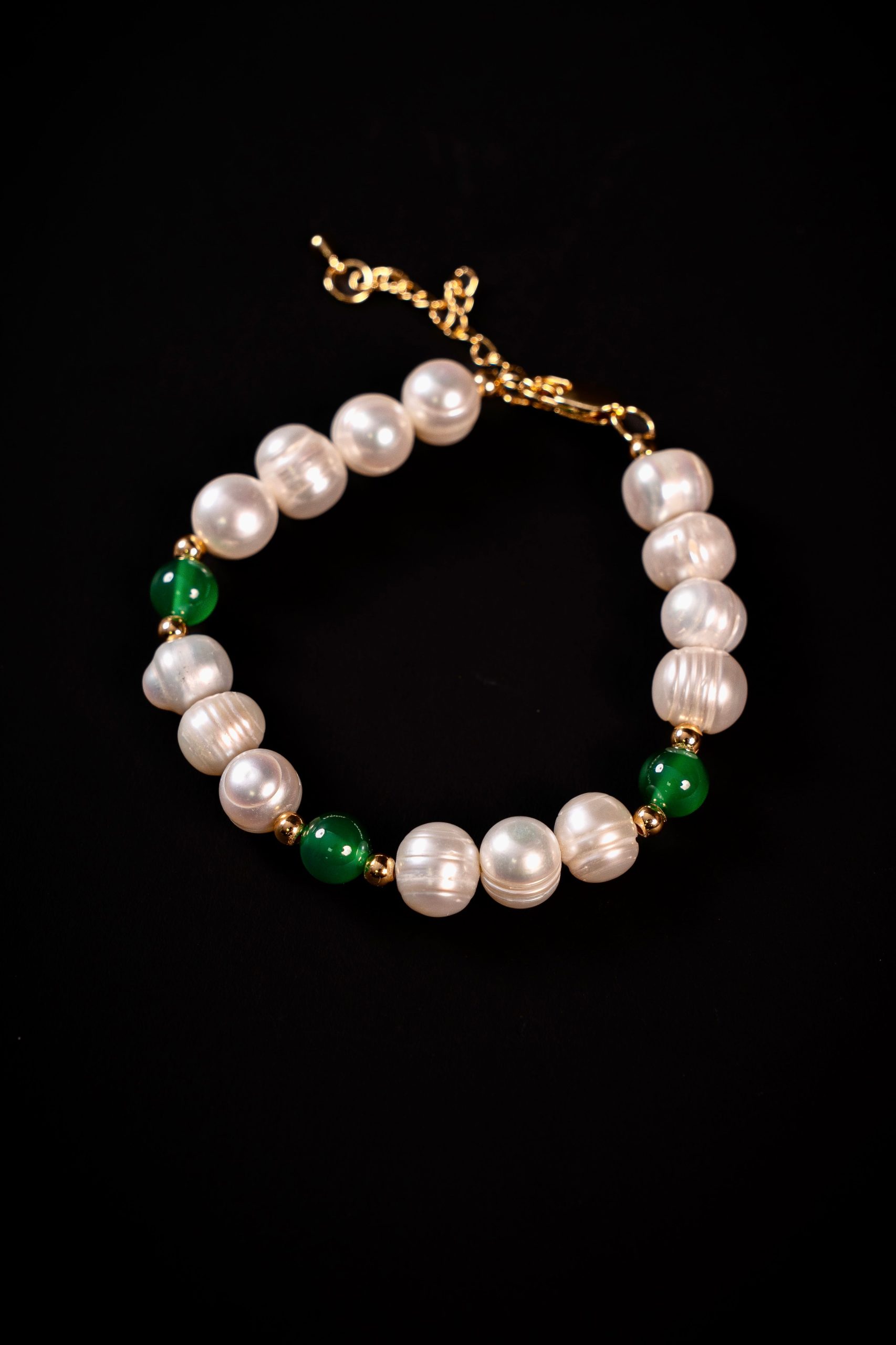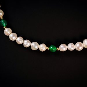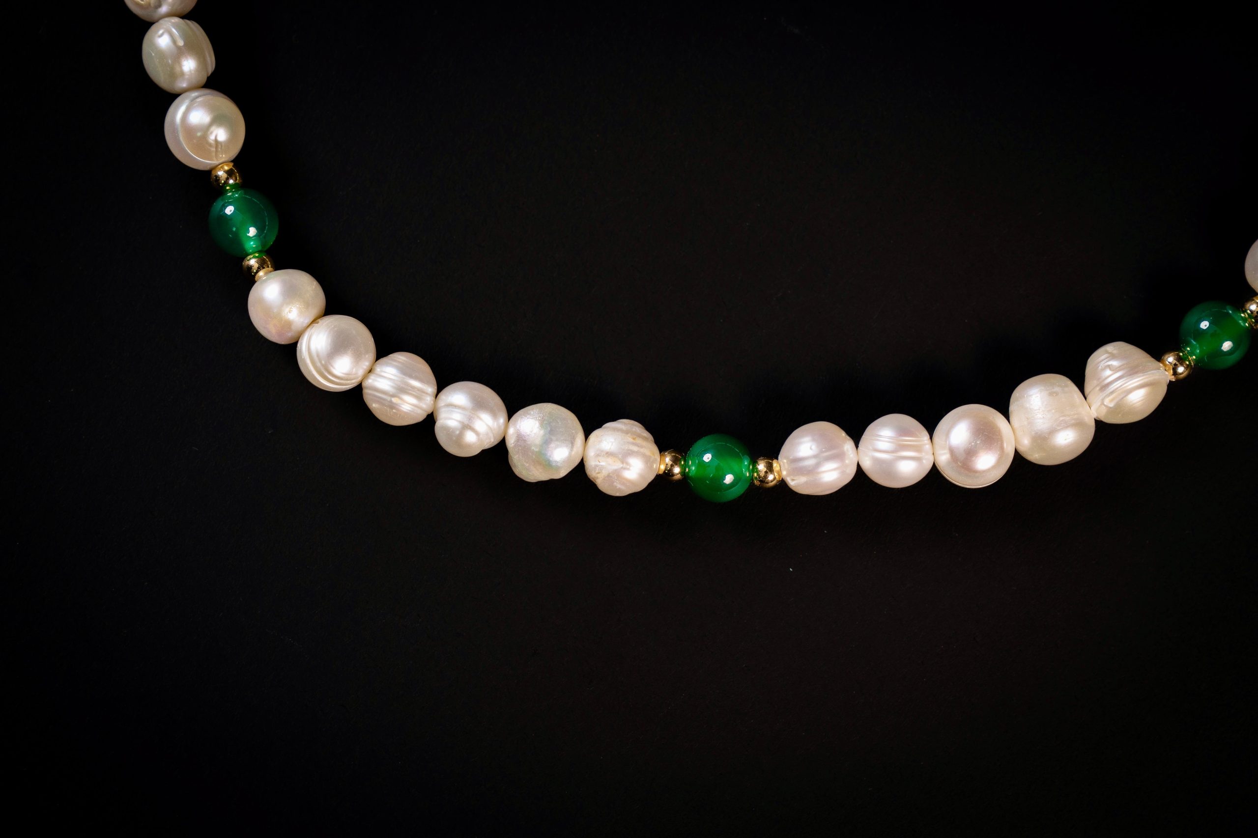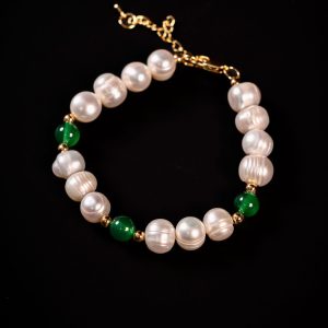 The luminous softness of 9–10mm natural freshwater pearls meets the rich green depth of 8mm jade, creating a composition that feels both fresh and sophisticated.