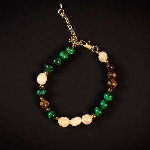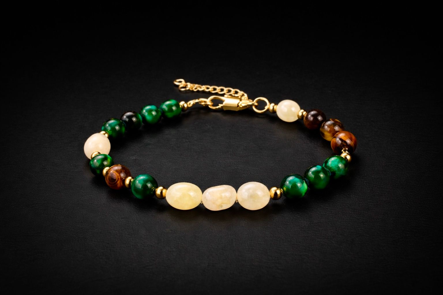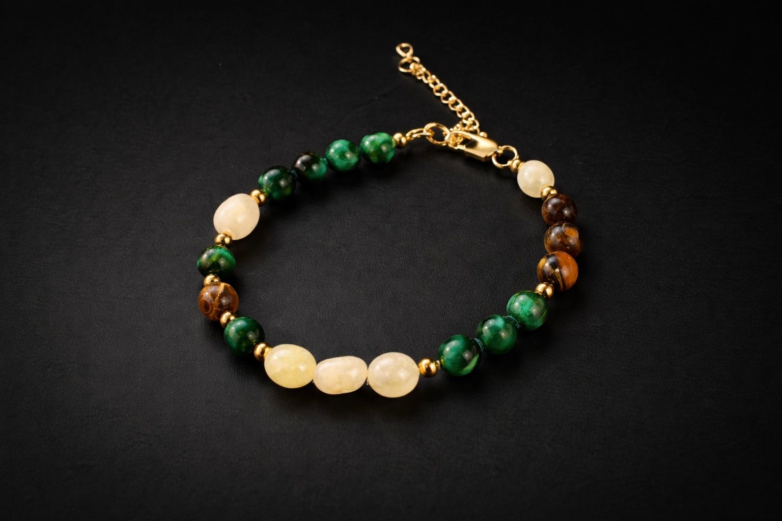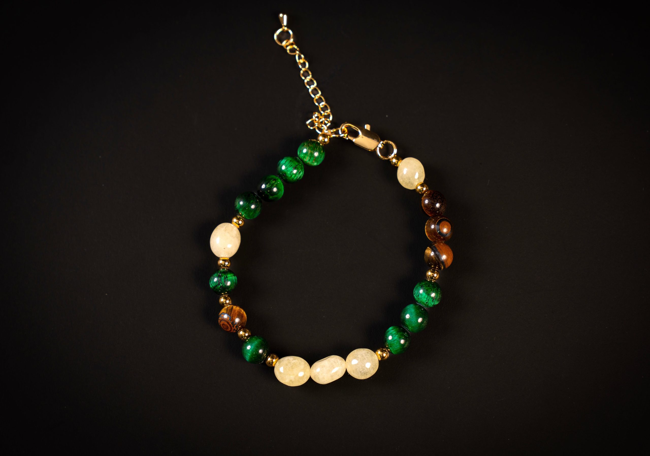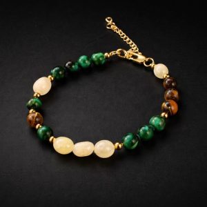 Crafted from carefully selected 8mm natural stones, this piece blends the radiant warmth of Citrine, the deep green intensity of Malachite, and the rich golden tones of Tiger Eye — creating a bold yet balanced composition.