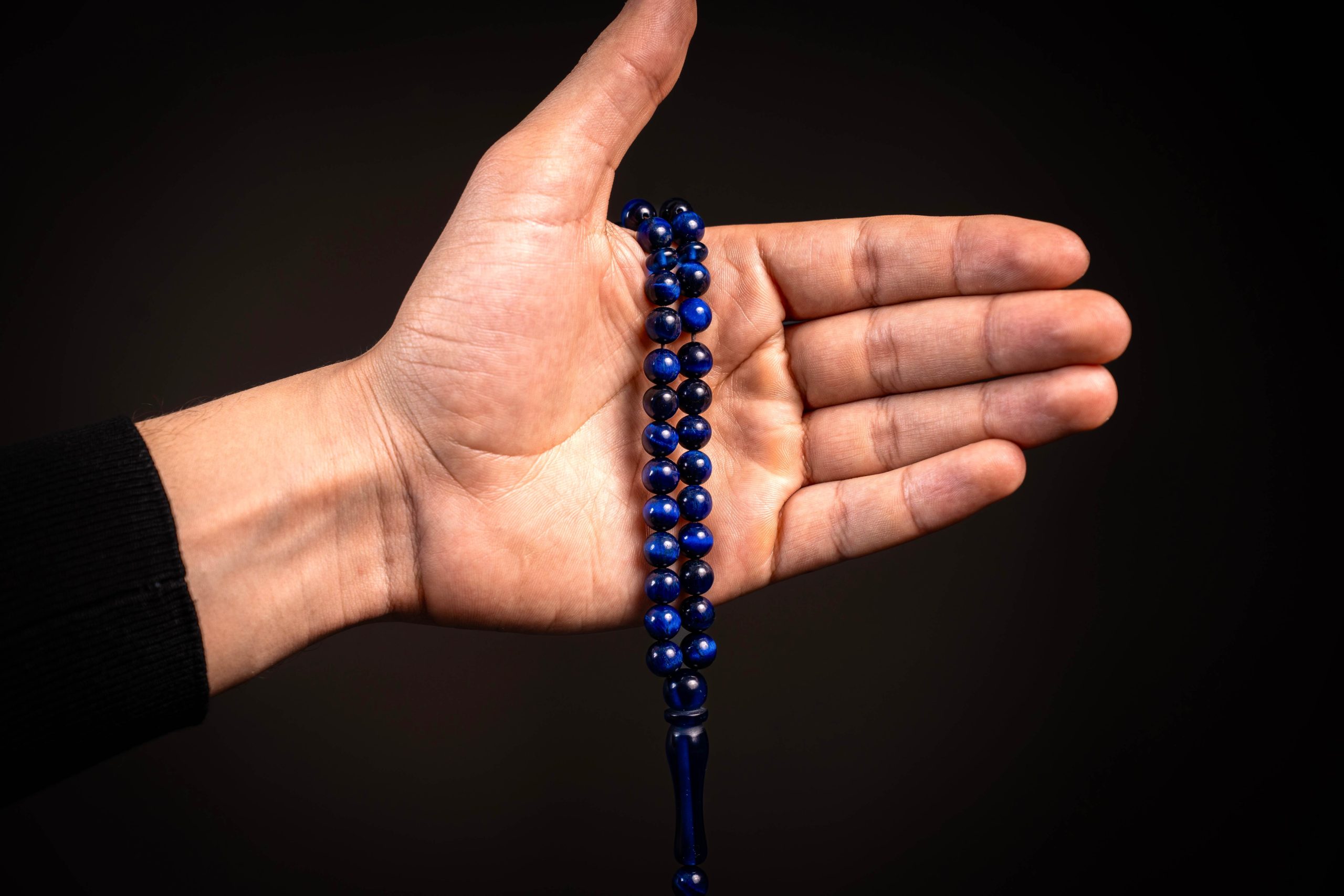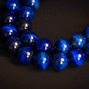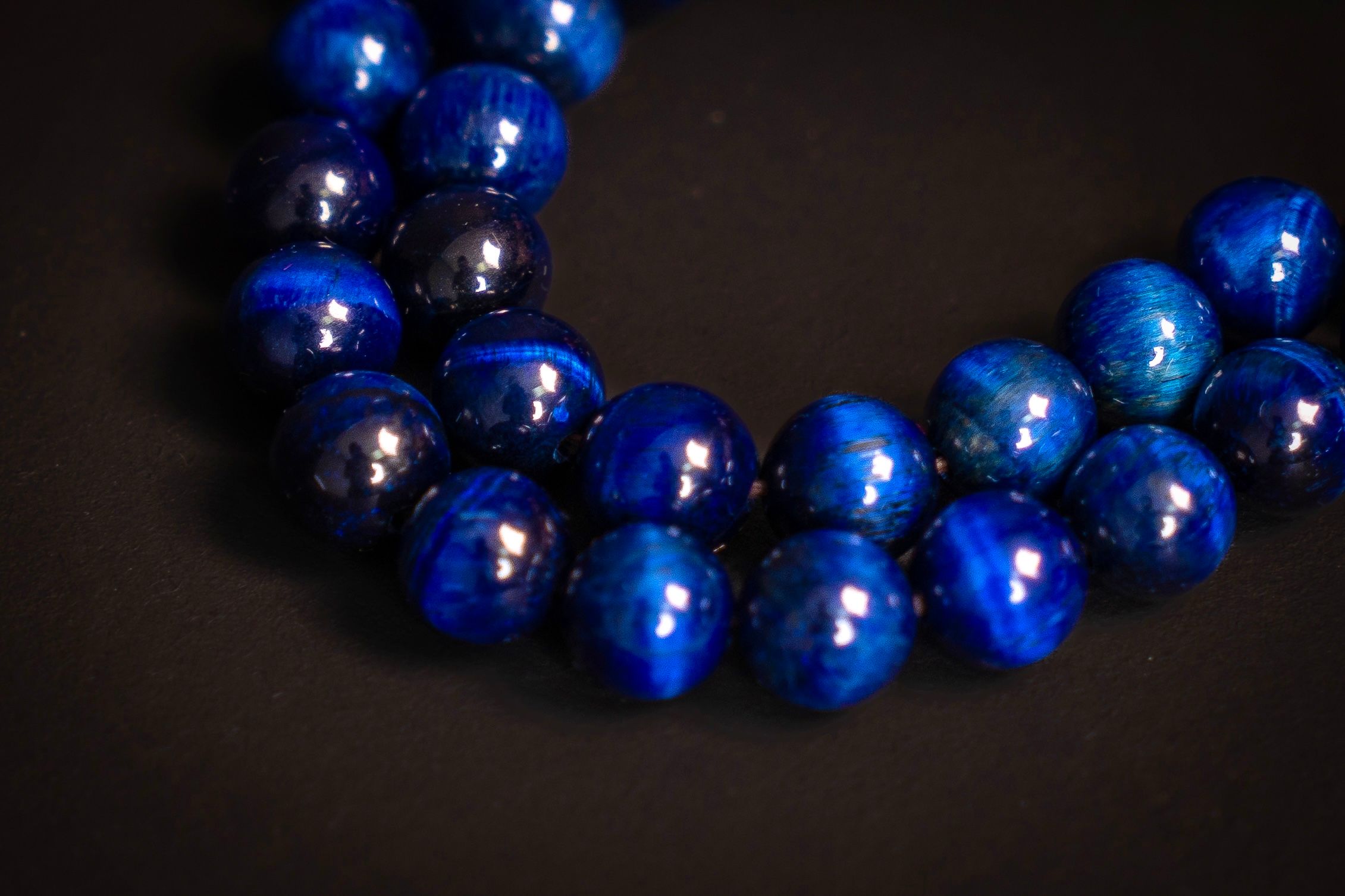 Crafted from natural 8mm Blue Tiger Eye, each bead reveals deep midnight tones with subtle shifting reflections. The 33-bead configuration creates a balanced design that combines presence with everyday versatility.